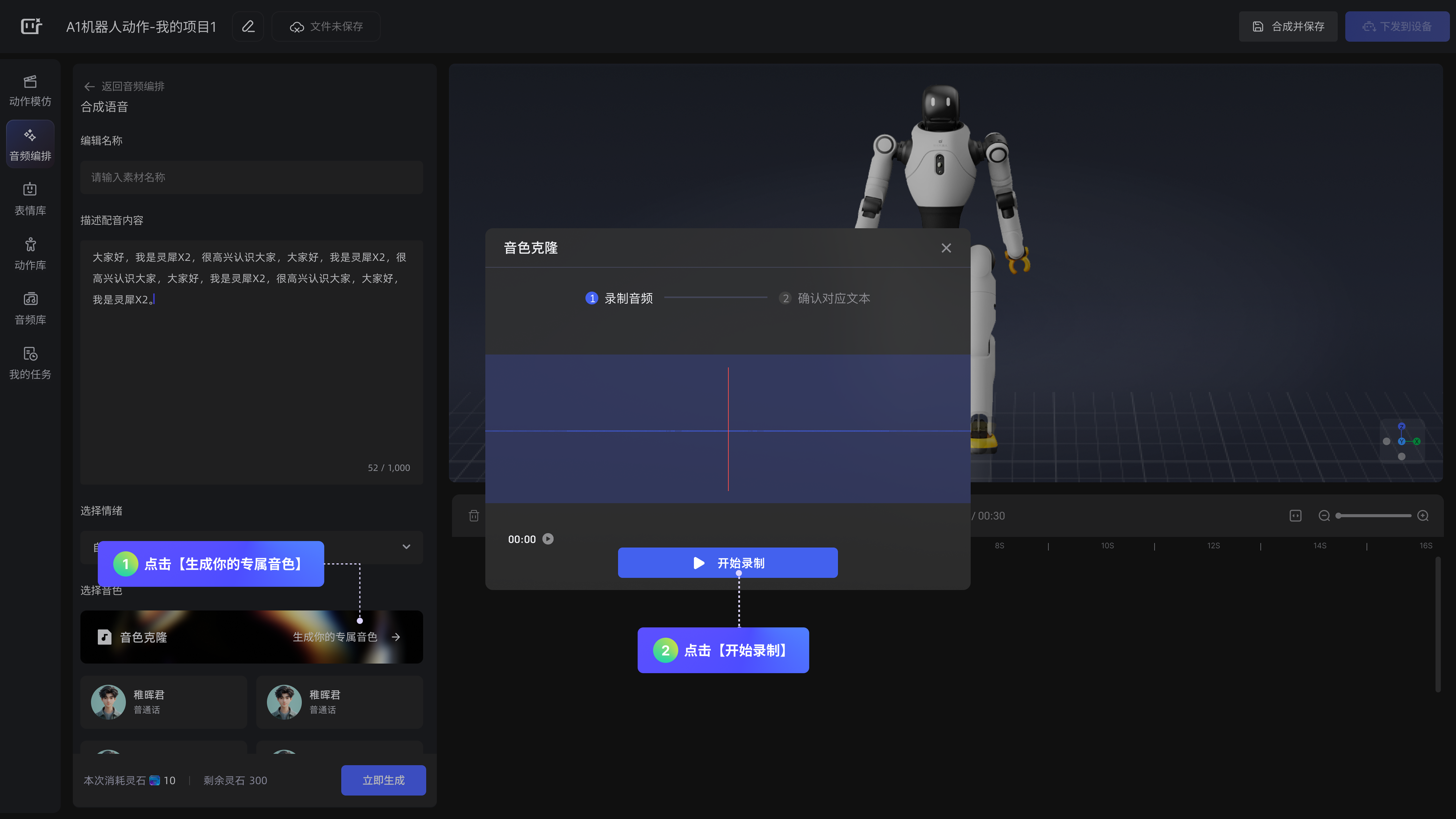 在「选择机型」弹窗点击【确认】按钮后,即可进入「创作主页面」,从零开始构建机器人演绎内容。可自由编排音频、动作与表情,进行个性化创作。