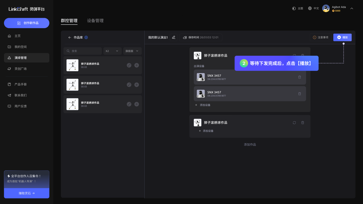 可以对指定机器人进行下发演绎作品。