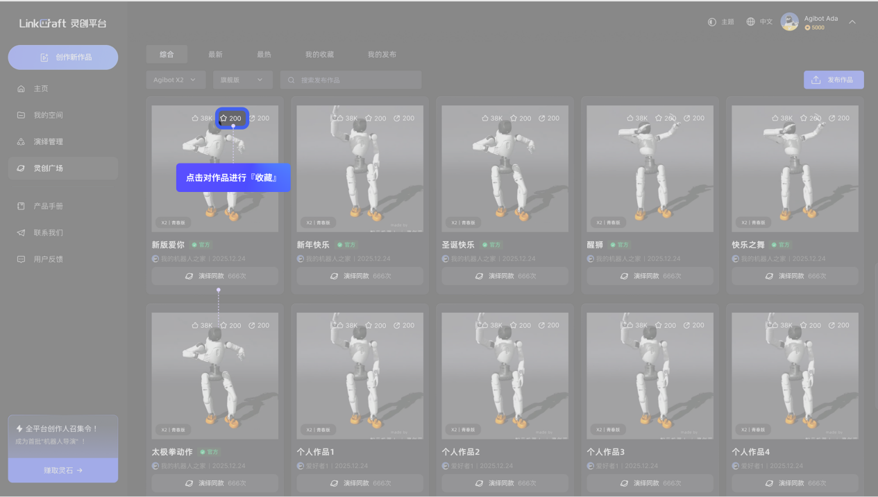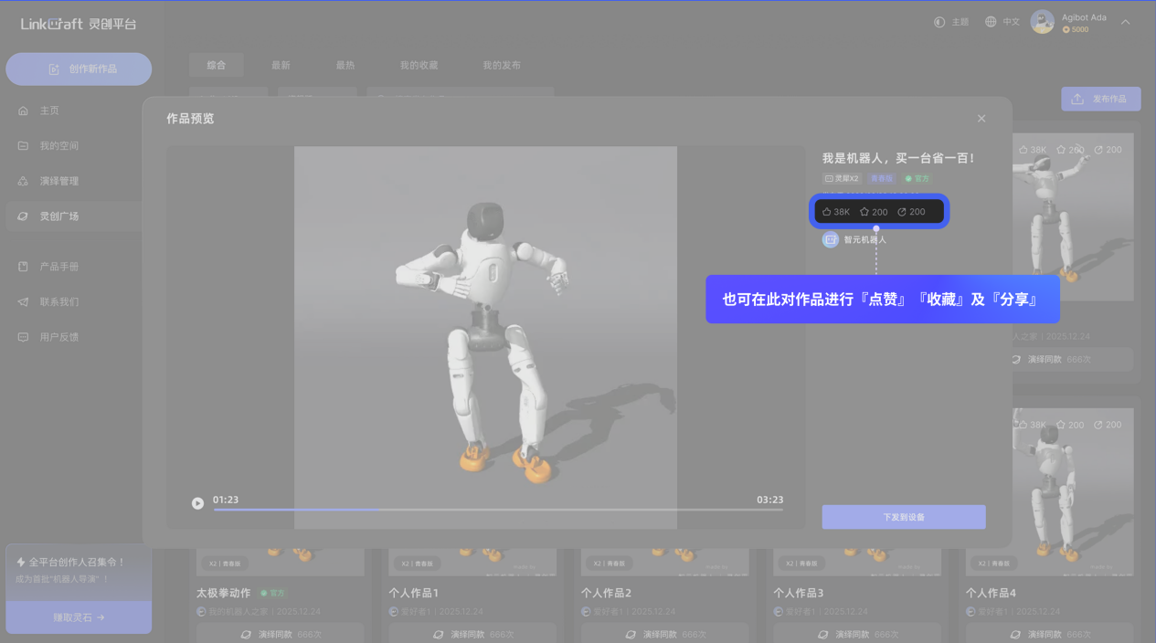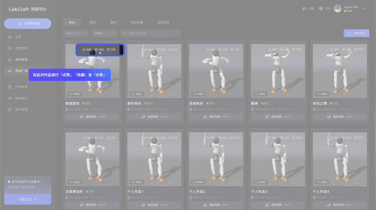 「灵创广场」:可在此查看、收藏全社区的机器人演绎作品,同时,用户可在此将个人作品分享至「灵创广场」,与全球用户共享创作成果。