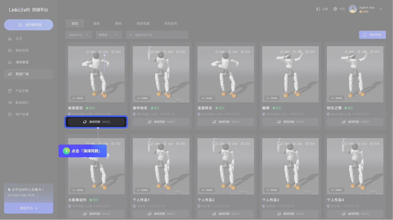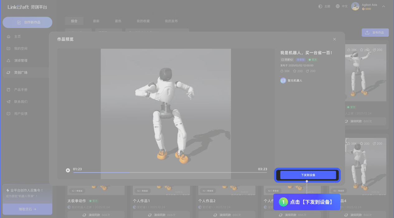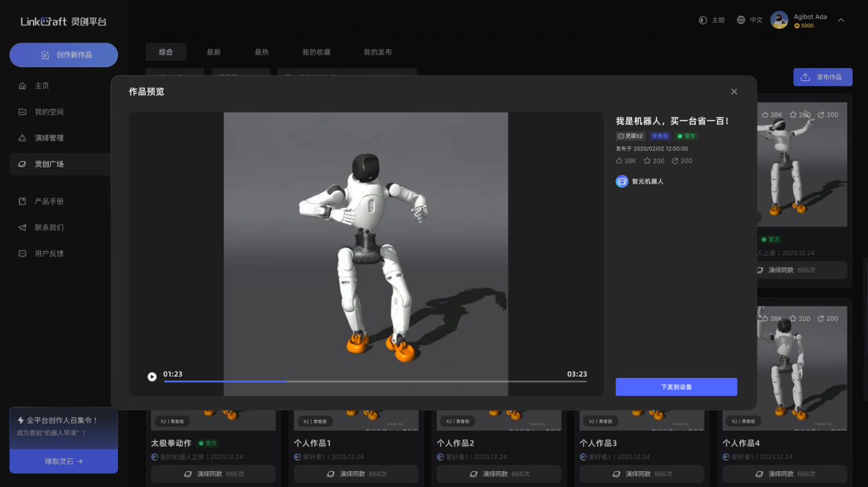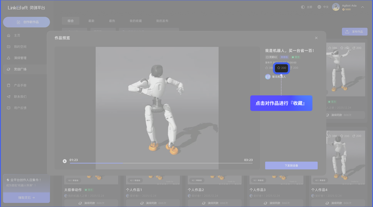 「灵创广场」:可在此查看、收藏全社区的机器人演绎作品,同时,用户可在此将个人作品分享至「灵创广场」,与全球用户共享创作成果。